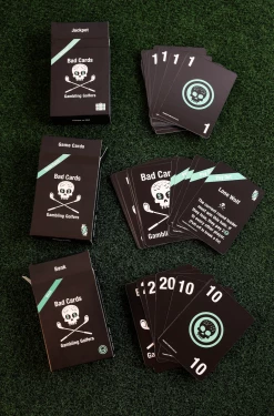 Draw one card per hole to decide the bet amount and wager. Half of the cards will have you paying (or getting paid by) other players, half of the cards will have you paying into the jackpot. The winner of the round takes the jackpot!